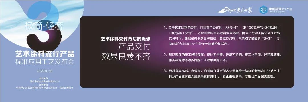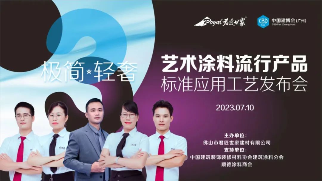 7月10日,在中國建博會(廣州)上,君匠世家隆重的舉辦了2023藝術(shù)涂料流行產(chǎn)品標(biāo)準(zhǔn)應(yīng)用工藝發(fā)布會。此次發(fā)布會得到了多方的支持與關(guān)注,與會的領(lǐng)導(dǎo)嘉賓有中國建筑裝飾裝修材料協(xié)會建筑涂料分會副秘書長賢冬先生、順德涂料商會會長羅宇先生、順德涂料商會榮譽(yù)會長胡景釗先生、君匠世家藝術(shù)涂料總經(jīng)理李東明先生等,領(lǐng)導(dǎo)嘉賓與現(xiàn)場觀眾一道,共同見證君匠世家藝術(shù)涂料的年度匠心之舉,以及一同探索藝術(shù)涂料行業(yè)產(chǎn)品標(biāo)準(zhǔn)應(yīng)用工藝的未來之路。
